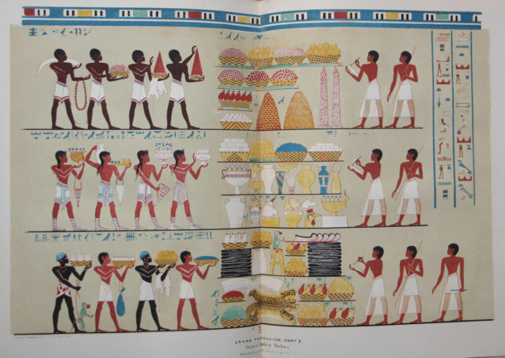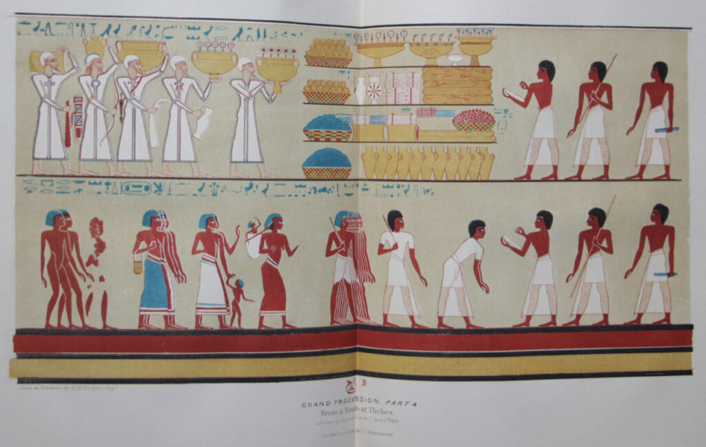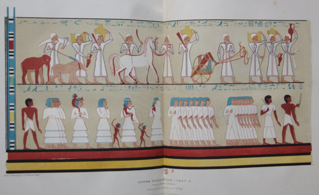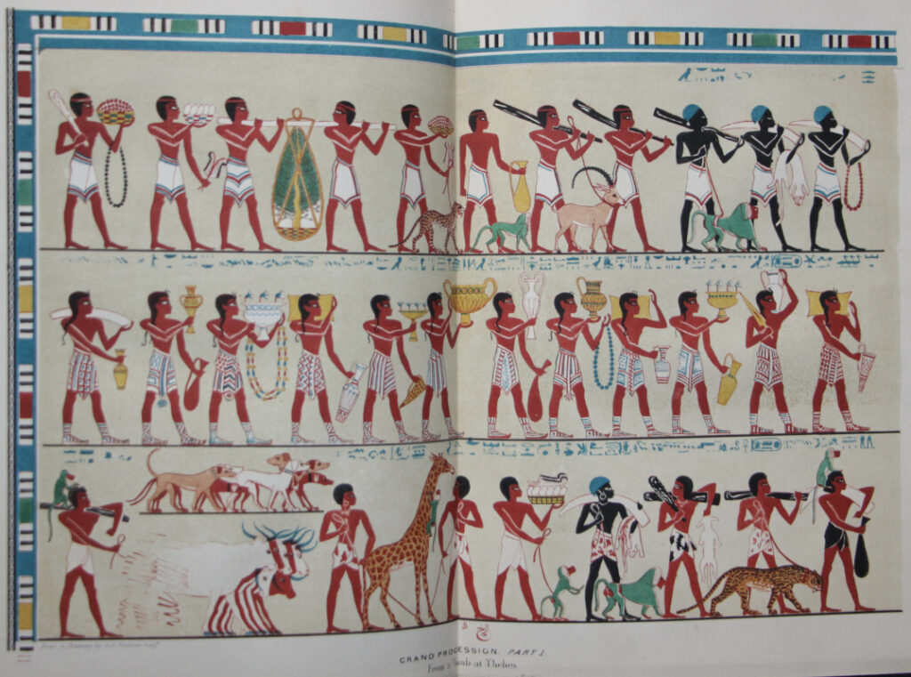 In our copy the Nubians are depicted with blue skull caps and there are some more colour changes in these chromolithographs, like for instance clearly visible in the bottom row of part 2 of the Grand Procession. A mesmerizing book, only seldom found in its original publisher’s binding.