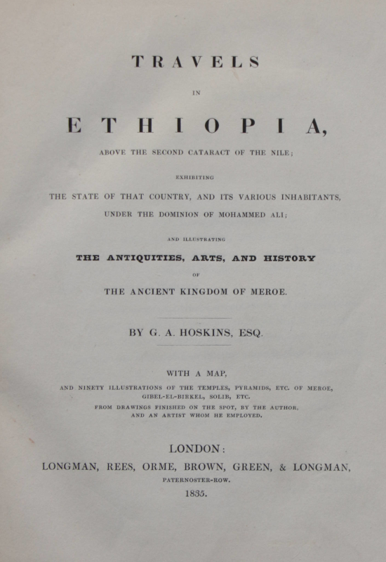 Full title: Travels in Ethiopia, above the second cataract of the Nile: exhibiting the state of that country, and its various inhabitants, under the dominion of Mohammed Ali and illustrating the antiquities, arts, and history of the ancient kingdom of Meroe.