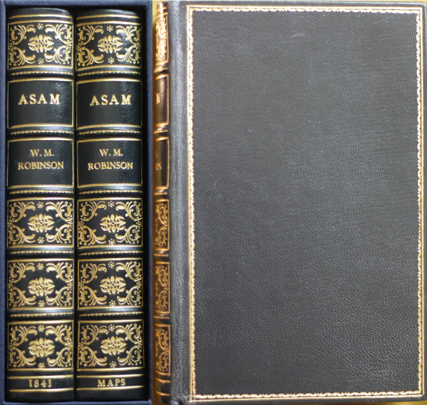 Blue cloth slipcase containing the text volume, 8vo., pp. xv, 421 and a custom made solander box containing four maps. Both the text volume and the solander box bound in matching blue morocco gilt. The spines divided in six compartments by five raised, gilt bands with the titles in the second and third compartments. The other compartments richly decorated in gilt.