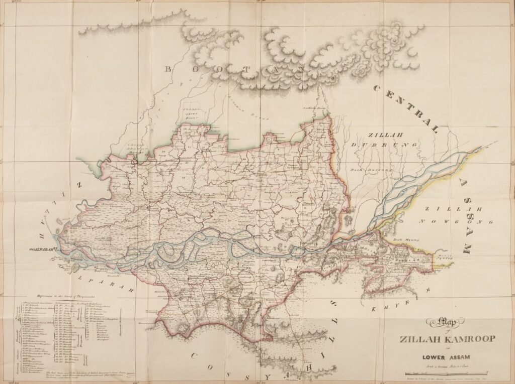 Of the four maps one map is a general map of Assam, the other three maps cover the Zilla of Kamroop, the Zilla of Durrung and Nowgong. The maps are hand-coloured in outline and are printed in various dimensions, approx. 46 x 60 cm to 60 x 80 cm.