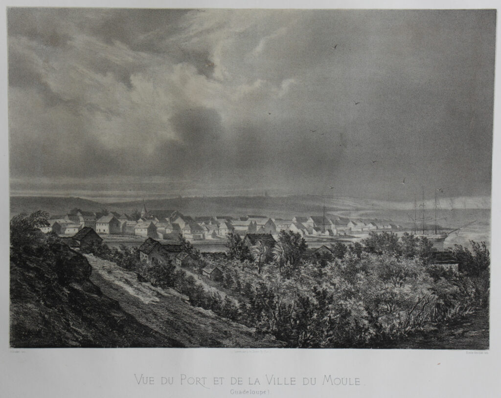 Folio album, sized 55,5 x 39,5 cm, containing a rare series of views including the principal towns, Moule and l’Anse Bertrand, and a fine panoramic view of the town and harbour of Pointe-à-Pietre.