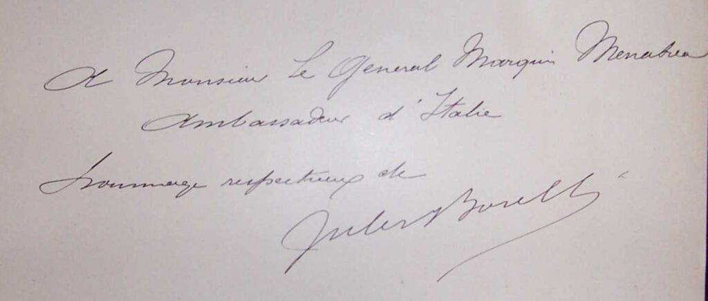 A gift inscription by Borelli in his book “Éthiopie Méridionale. Journal de mon Voyage aux Pays Amhara, Oromo et Sidama” for Marquess Menabrea. The book was published by Ancienne Maison Quentin in 1890.