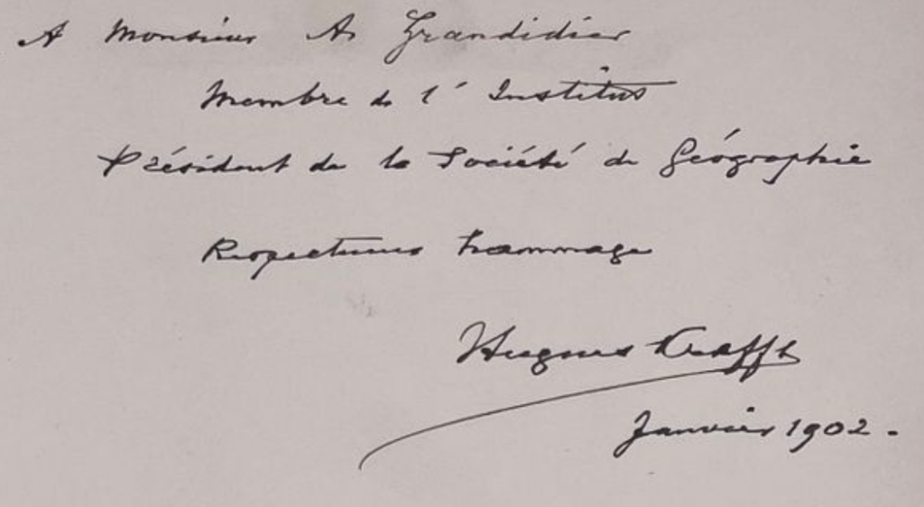 A gift inscription by Hugues Krafft in his book “A travers le Turkestan Russe” for Alfred Grandidier who, at the time, was the president of the Société de Géographie, while Krafft was an important member of that organisation. Krafft’s book was published in 1902 by Hachette.