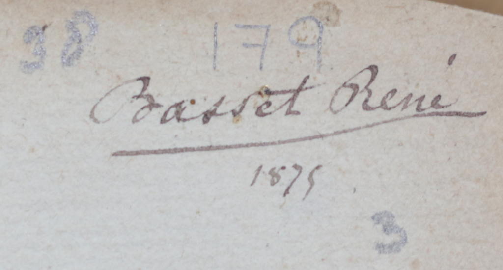 The ownership inscription of René Basset, the French orientalist and linguist, especially known for his work on the Arabic and Berber languages, in Godefroy Loyer’s “Relation du voyage du Royaume d’Issyny”, published in 1714 by Arnoul Seneuze et Jean-Raoul Morel.