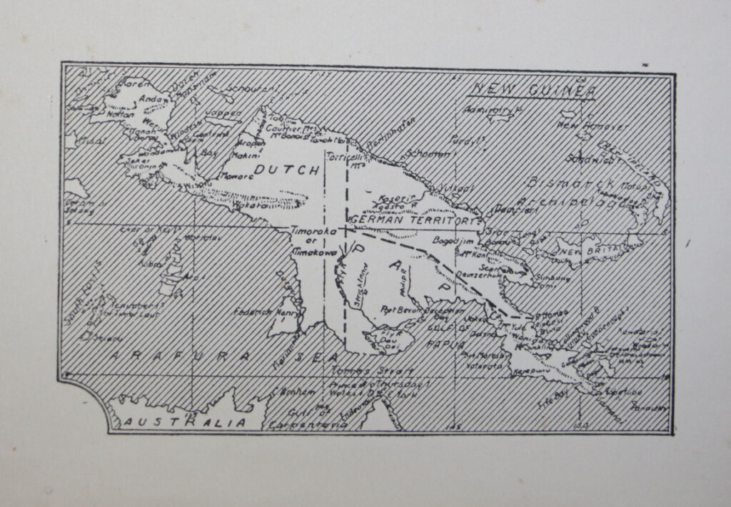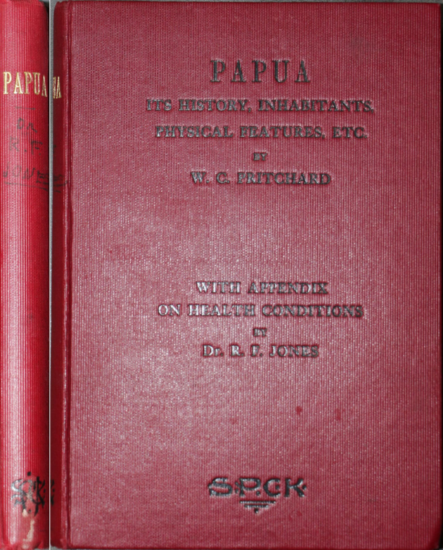 Publishers red cloth, 16mo, pp. 96, 16 (ads). ‘Papua’ in gilt on the spine, full title in black on frontboard. With a black linemarker someone has written ‘Dr. R.F. Jones’ on the spine, which name has faded. Another name plus date written in ink on the title page and an occasional dog ear.